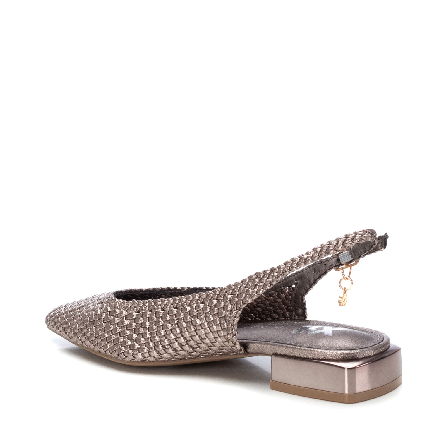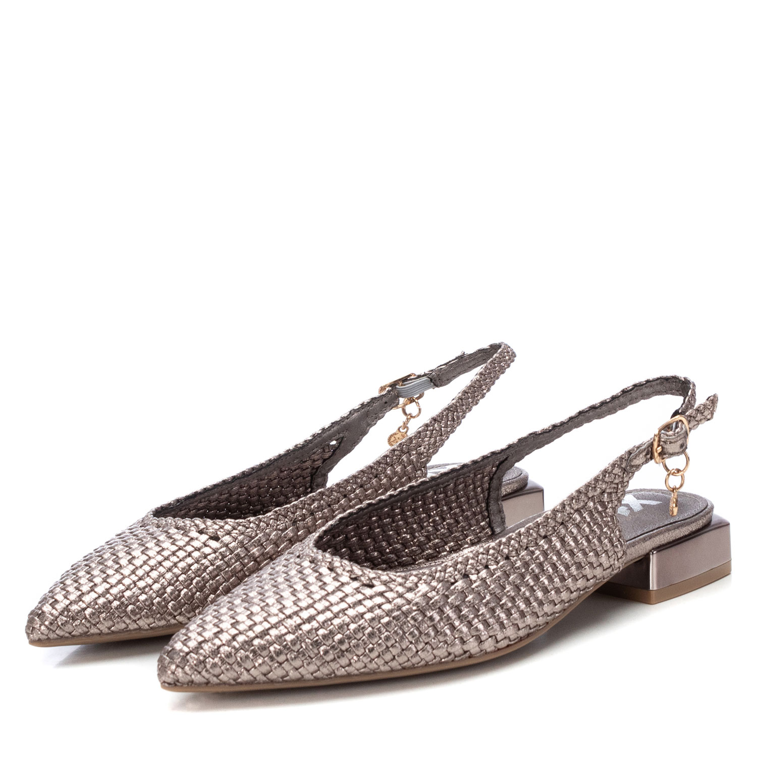 Zapato destalonado de mujer. de la marca Xti. Fabricado en material textil con acabado metalizado. Modelo trenzado con hebilla metálica en el tobillo con muy buena sujeción. Ideal para todos tus conjuntos. Este modelo ha obtenido el certificado vegano por la organización mundial PETA (Organización de los derechos de los animales).