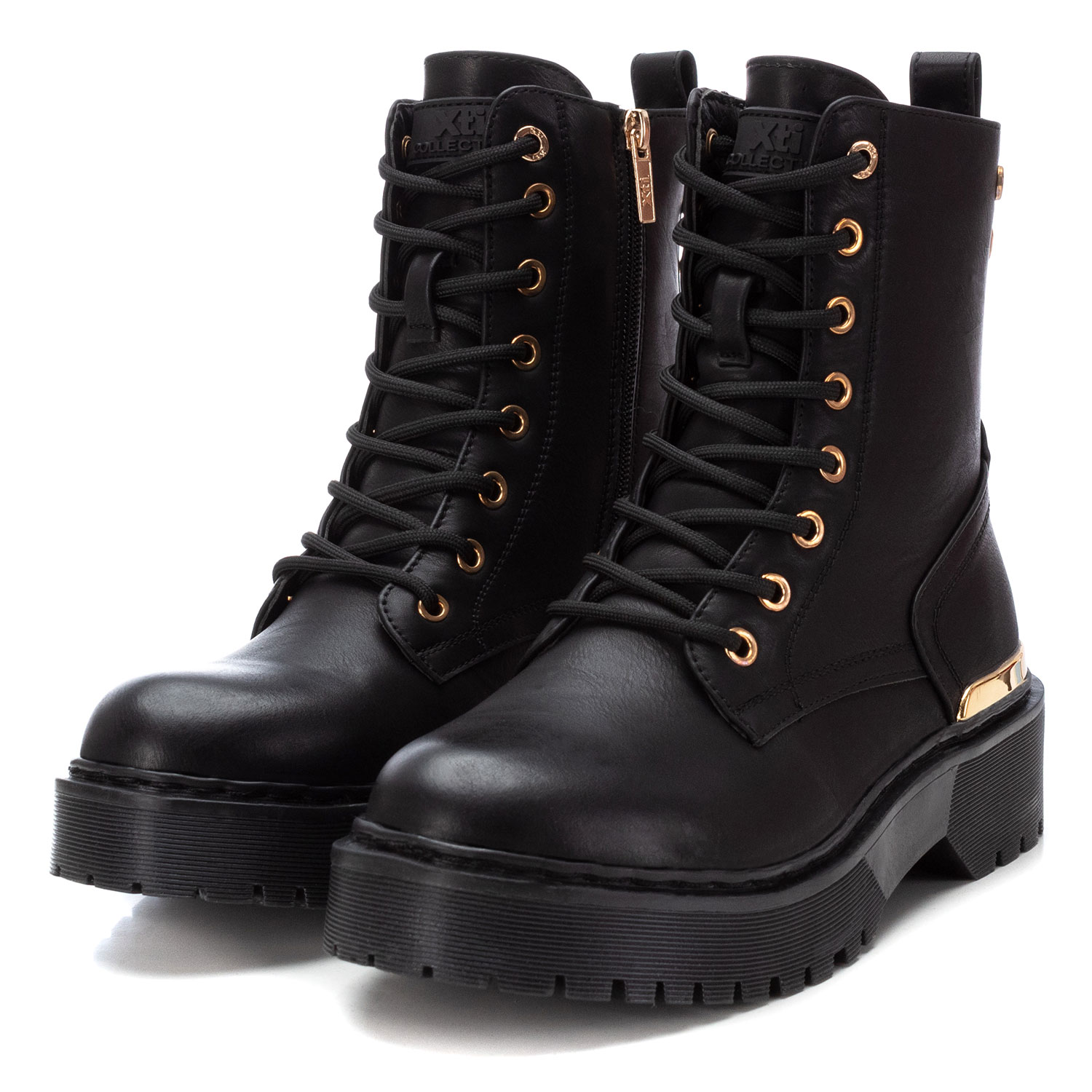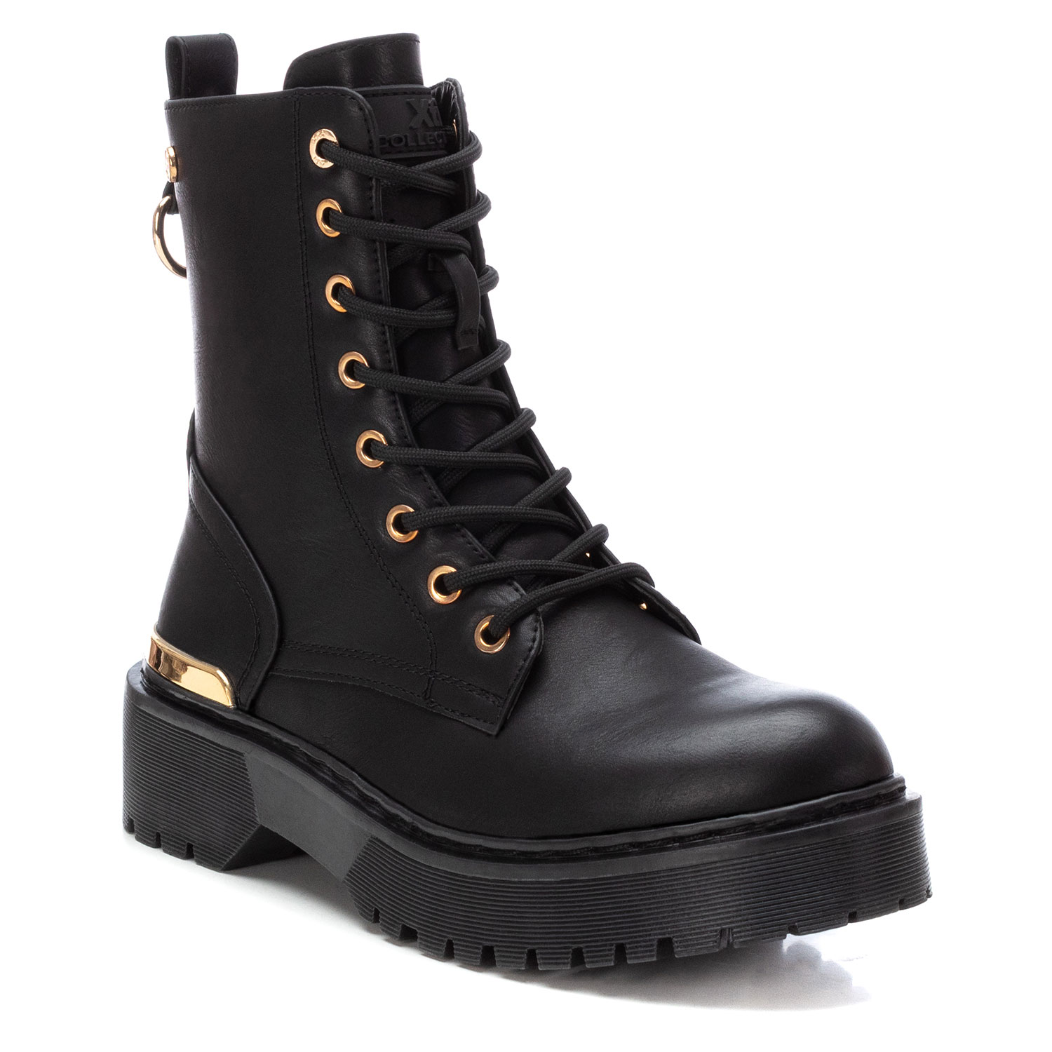 Botín de mujer. de la marca Xti. Fabricado en material que imita la piel. Cierre mediante cremallera lateral y cordones para un buen ajuste. Tirador trasero para facilitar la puesta. Suela gruesa de goma antideslizante. Este modelo ha obtenido el certificado vegano por la organización mundial PETA (Organización de los derechos de los animales).
