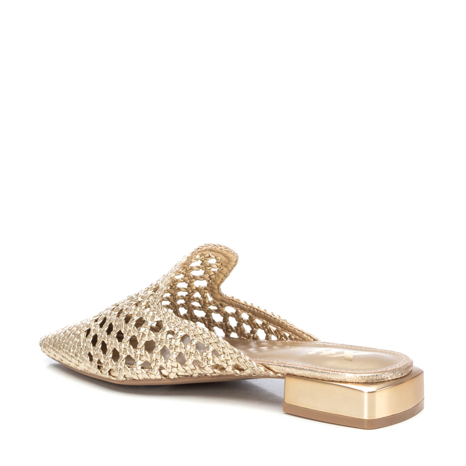 Mocasín destalonado de mujer. de la marca Xti. Fabricada en material textil con efecto metalizado. Modelo de rejilla con tacón bajo metalizado. Suela plana de goma antideslizante. Este modelo ha obtenido el certificado vegano por la organización mundial PETA (Organización de los derechos de los animales).
