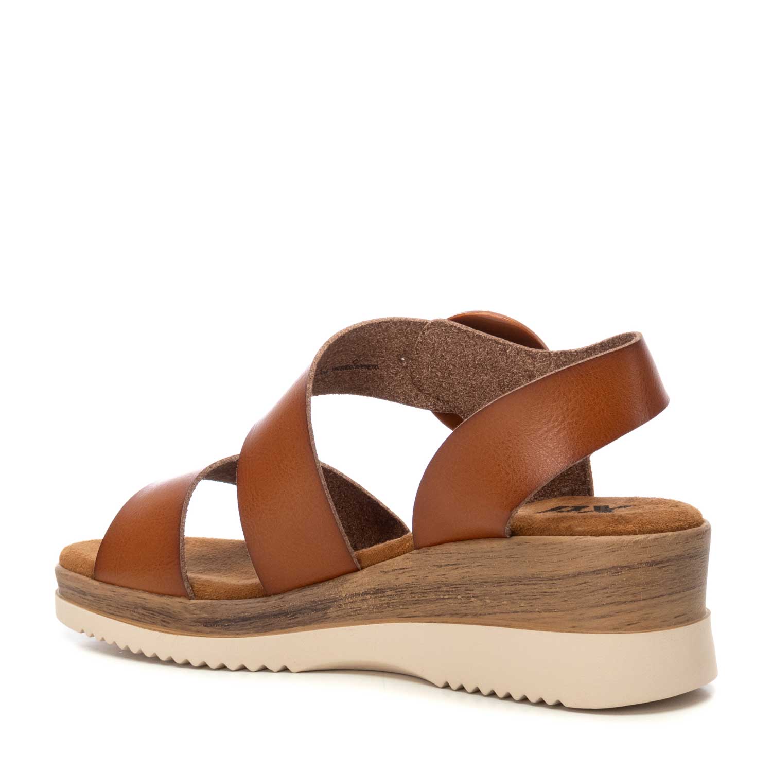 Sandalia de mujer de la marca Xti. Fabricado en material que imita la piel. Modelo de pala y tira cruzada con sujeción al tobillo con hebilla decorativa. Suela con pequeña cuña que apoya una gran comodidad para llevarlas durante todo el día. Este modelo ha obtenido el certificado vegano por la organización mundial PETA (Organización de los derechos de los animales).