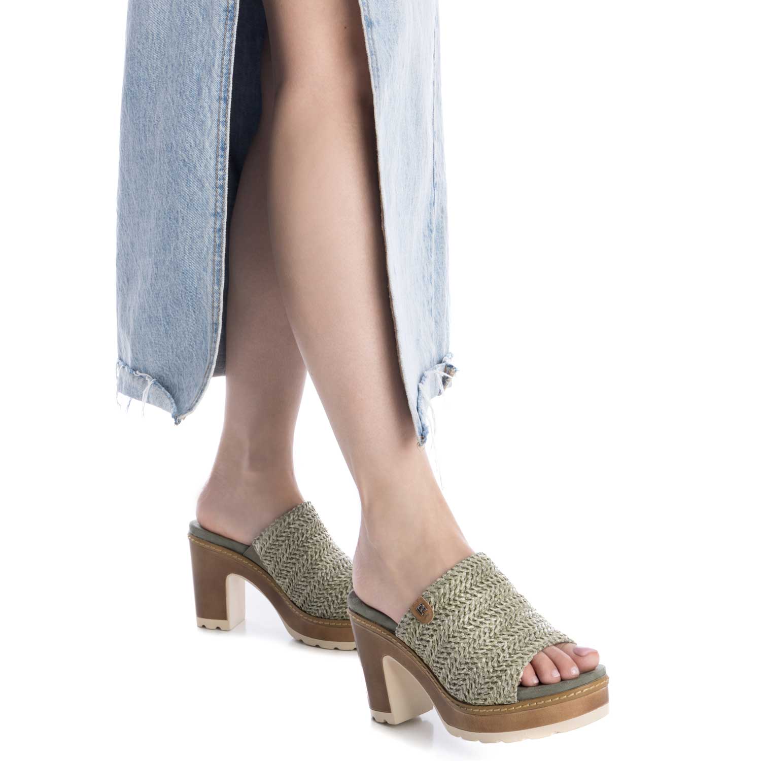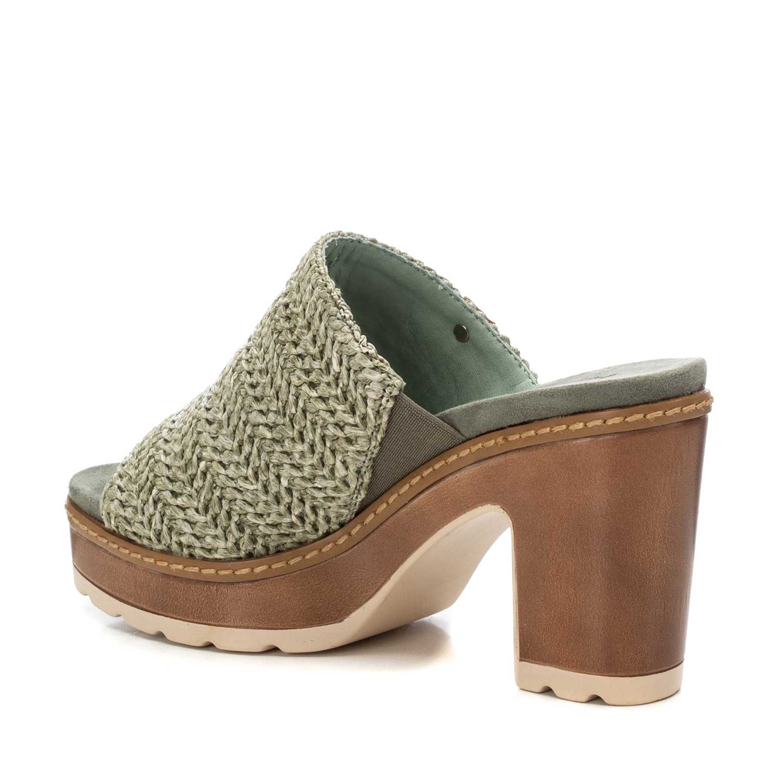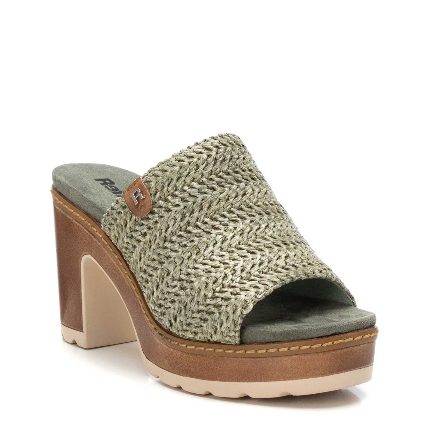 Sandalia de mujer. de la marca Refresh. Fabricada en material textil tipo rafia. Modelo estilo mule con tacón ancho de 10 cm y plataforma delantera. Suela antideslizante. Este modelo ha obtenido el certificado vegano por la organización mundial PETA (Organización de los derechos de los animales).