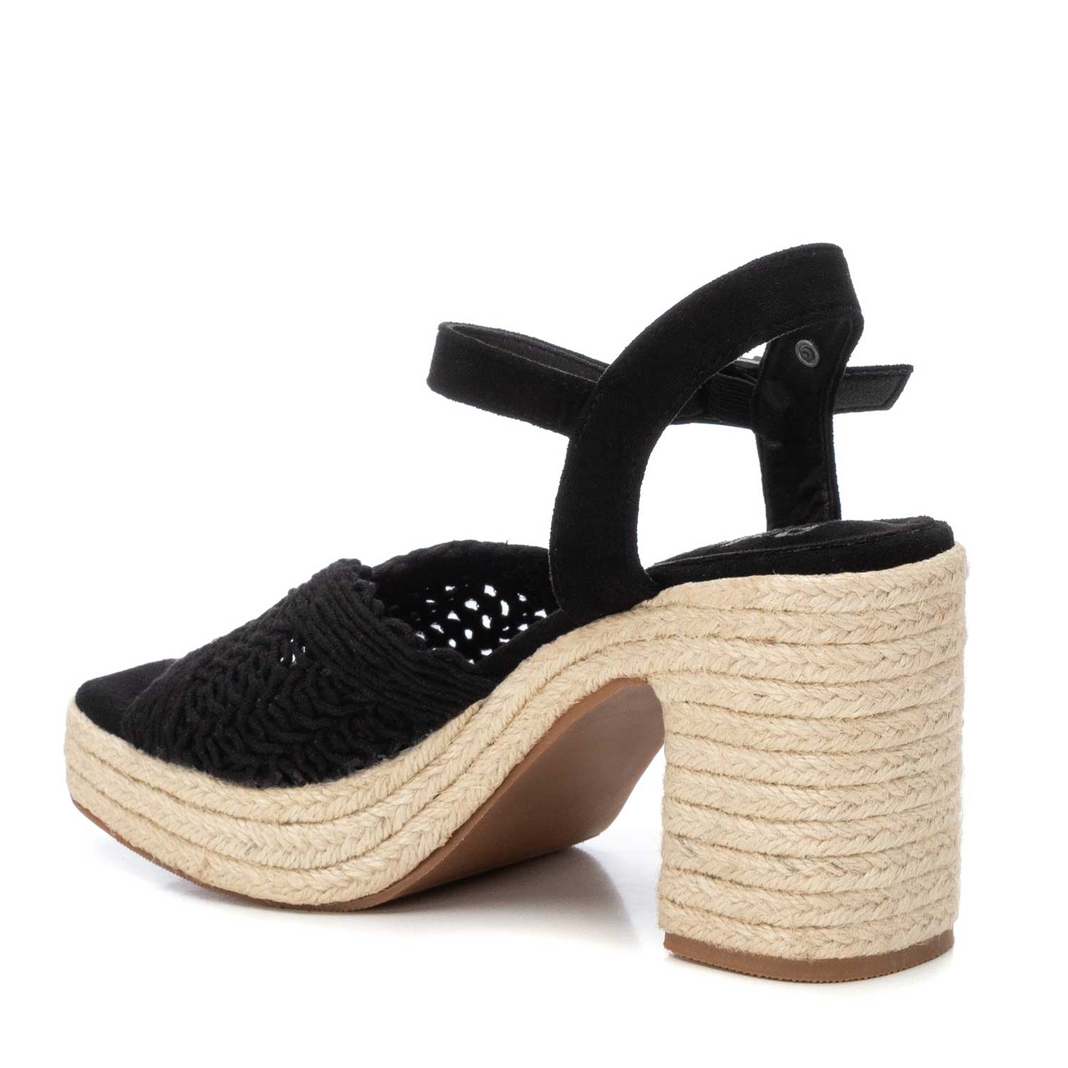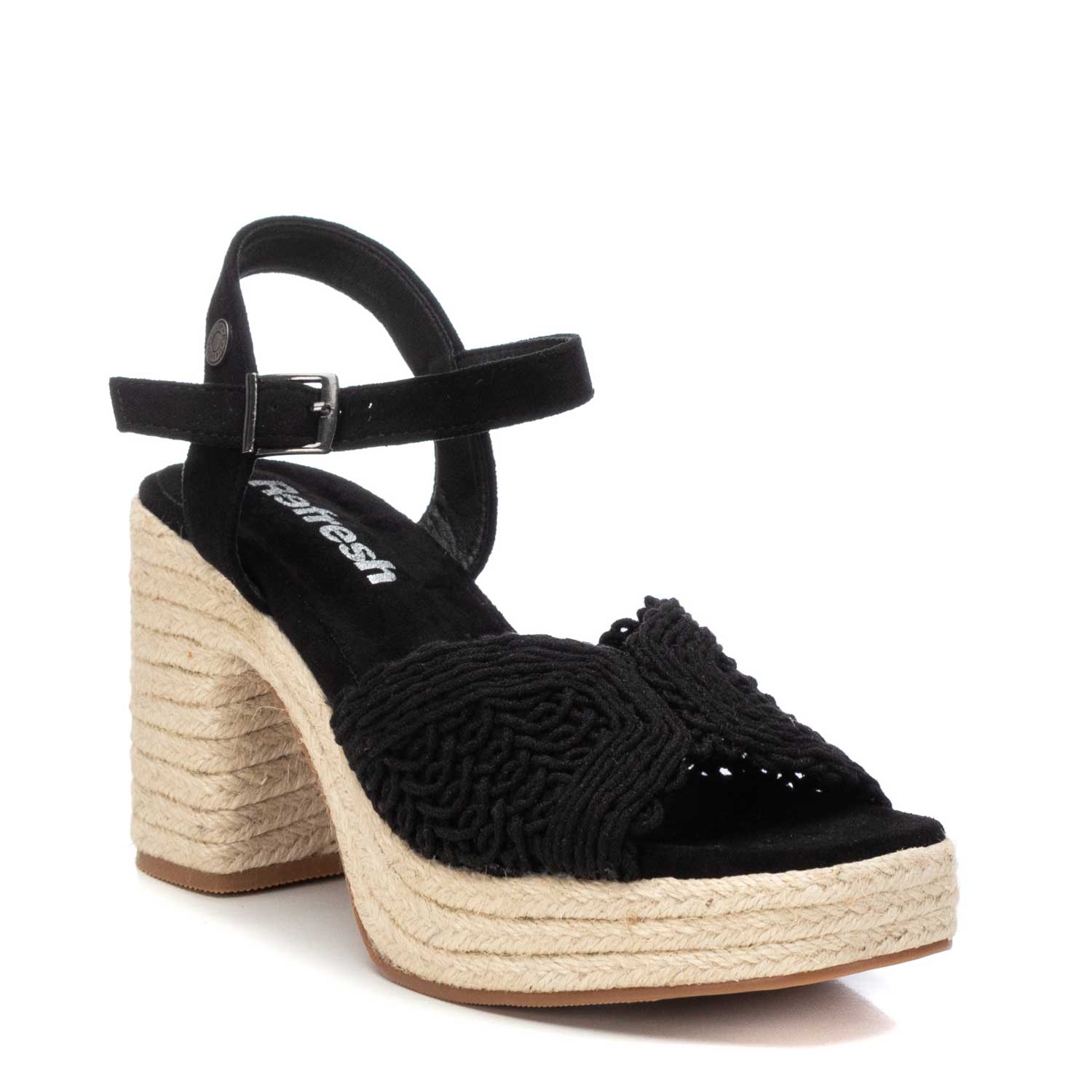 Sandalia de mujer. de la marca Refresh. Pala formada con tiras textiles creando una textura. Pulsera trasera en antelina. Cierre de hebilla. Tacón de 9 cm con plataforma forrada en yute. Suela de goma antideslizante. Este modelo ha obtenido el certificado vegano por la organización mundial PETA (Organización de los derechos de los animales).