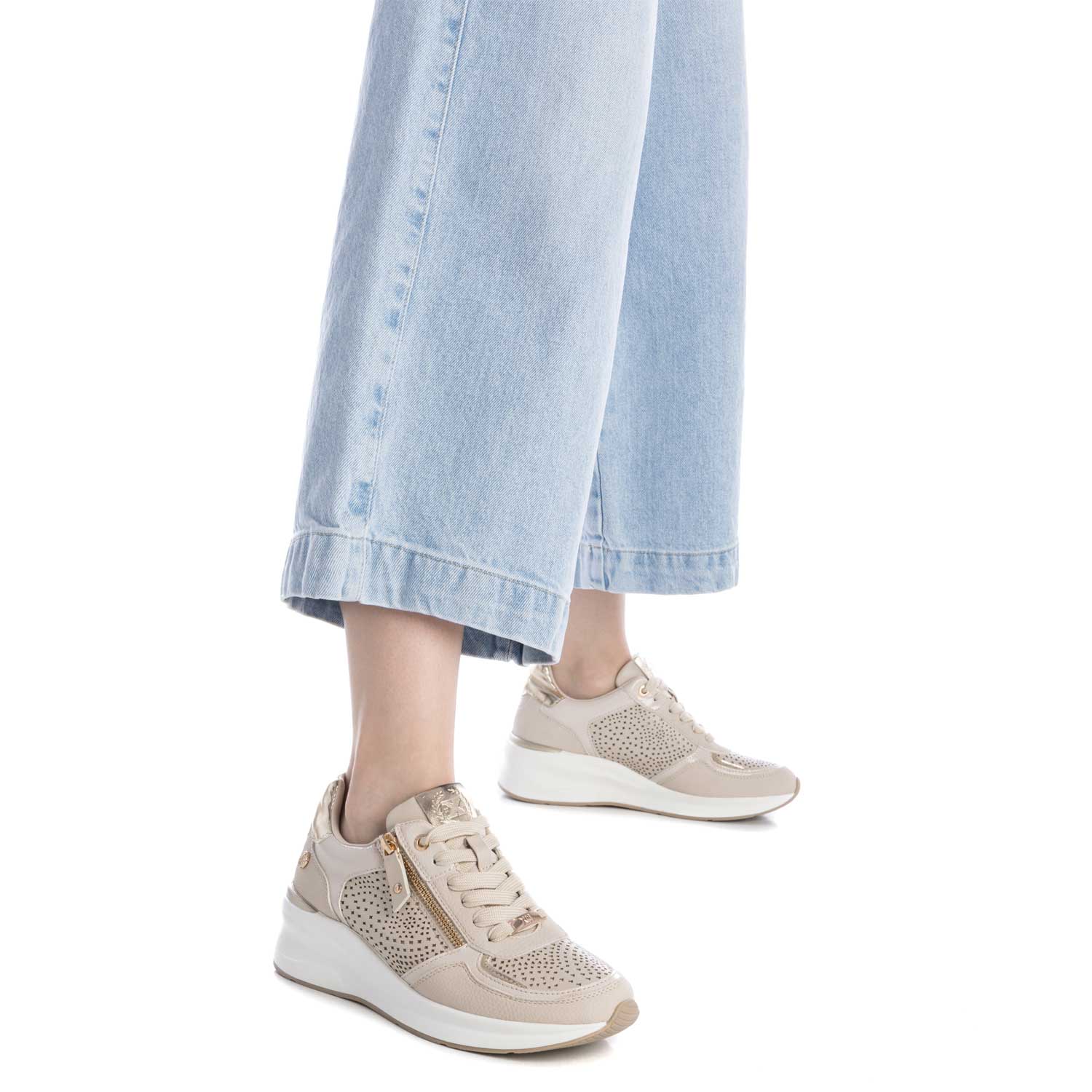 Zapatilla de mujer. de la marca Xti. Fabricada en material que imita la piel. combinada con charol y detalles metalizados.