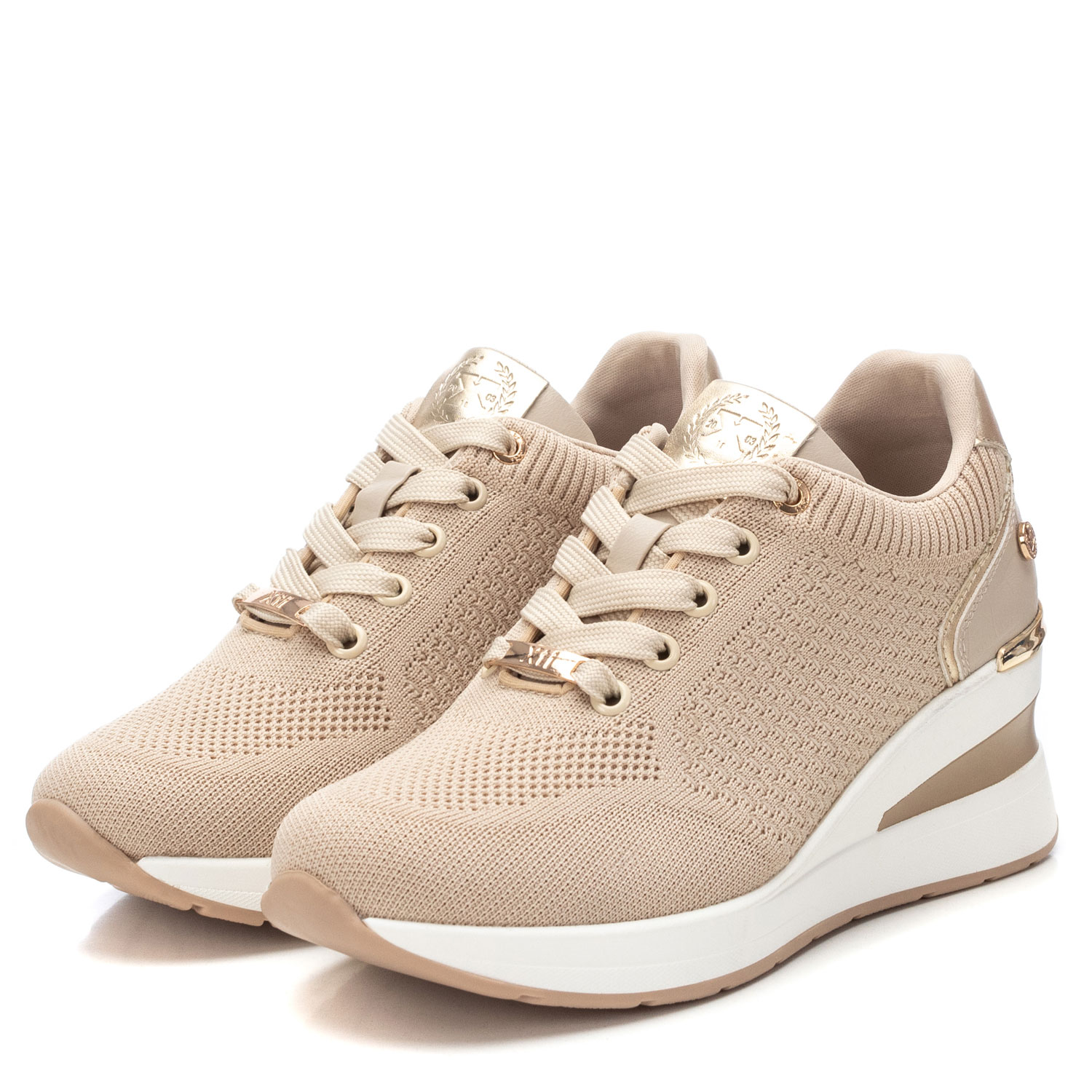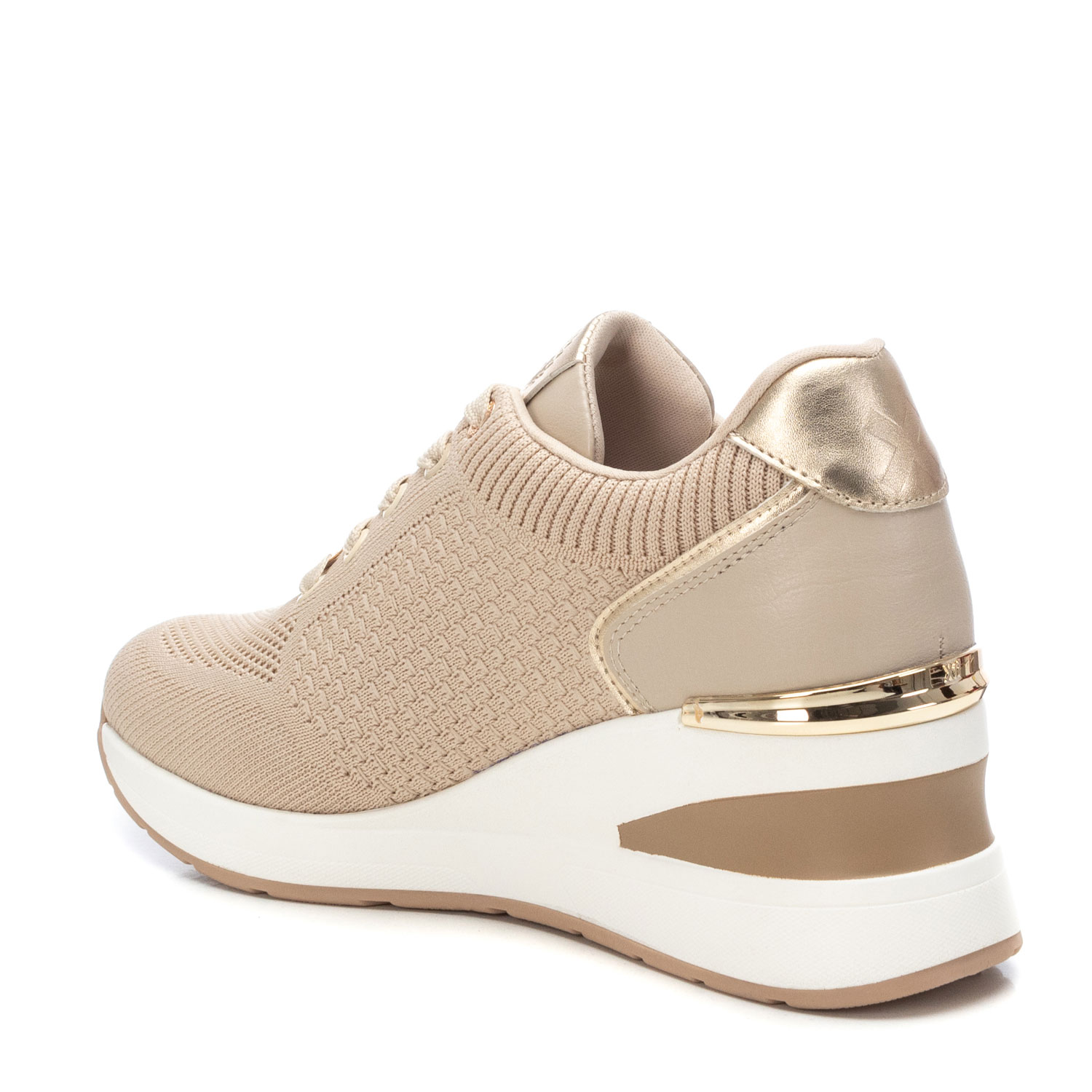 Zapatilla de mujer. de la marca Xti. Fabricada en material textil y detalles en metalizado. Cierre mediante cordones. Cuña con suela de goma antideslizante. Ideal para aportar unos cm sin perder comodidad. Este modelo ha obtenido el certificado vegano por la organización mundial PETA (Organización de los derechos de los animales).
